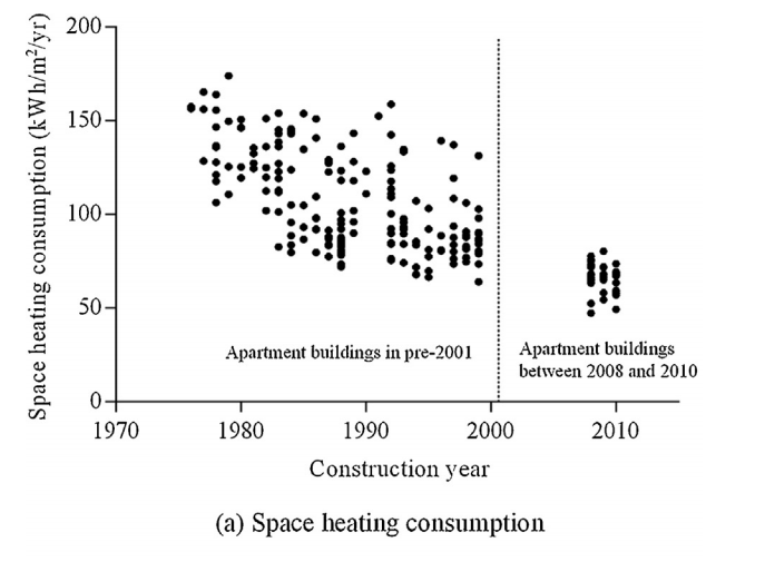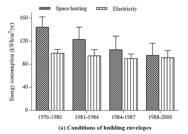 It can be seen that six of the eight features (Table 2) had an effect on energy consumption for space heating while little difference was found in electricity consumption. This can be explained by two opposing tendencies. As expected, one of these tendencies is that old apartment buildings constructed in the early stage consumed more energy than those constructed in the late stage. Three features, the conditions of building envelopes, the lengths of buildings and heating methods, accounted for this increasing tendency in energy consumption. This means that the transformations of the three features reduced energy consumption as seen in Fig. 5.