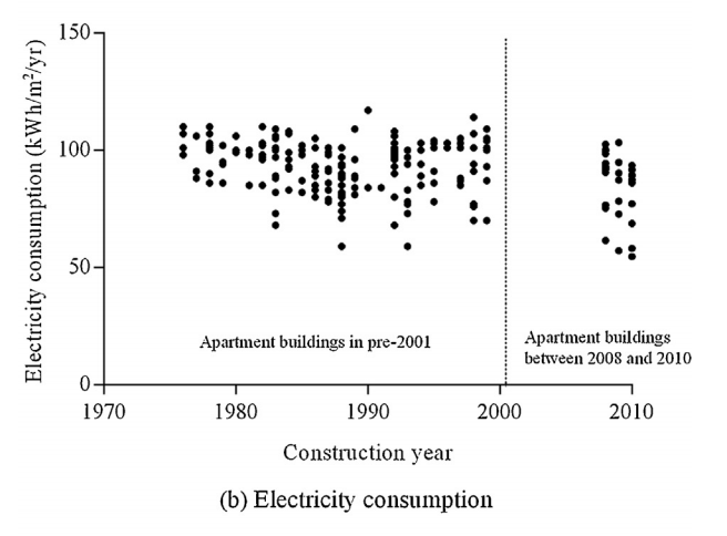 Overall, apartment buildings have been able to decrease energy consumption efficiently regarding space heating and cooling although there were not significant reduction in energy consumption for electricity and water heating. As identified in Section 2.2, physical conditions in apartment buildings constructed between 1976 and 2000 have been transformed. This would probably result in the changes of energy consumption in these buildings.