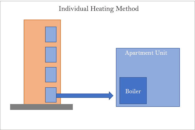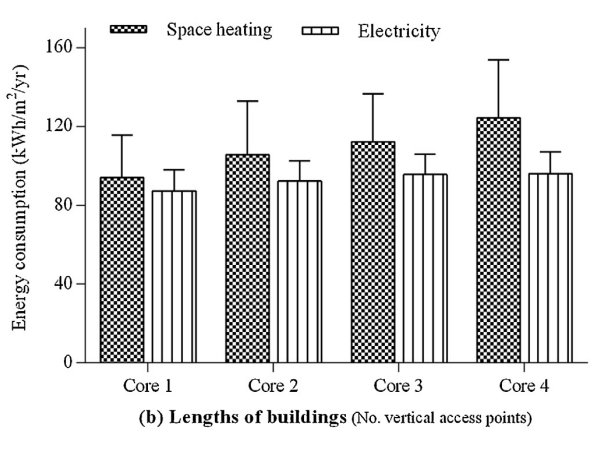 Second, the shorter lengths (that is with fewer vertical access points) the buildings had, the less energy consumed for space heating. Specifically, gradual energy reduction up to 30.2 kWh/m2/year was found by decreasing the lengths of buildings. As the heights of buildings were mostly fixed either 12 or 15 stories, the total amount of surface area, which is exposed to heat transfer, was reduced. Consequently, this was beneficial in reducing energy consumption. Third, the changes in heating methods also reduced up to a maximum of 26.2 kWh/m2/year of energy consumed for space heating. A large gap was found between buildings with central gas heating, and buildings with district and individual gas heating. 24.3 kWh/m2/year was found between central gas heating and district heating, but only 2.0 kWh/m2/year was found between district and individual gas heating.