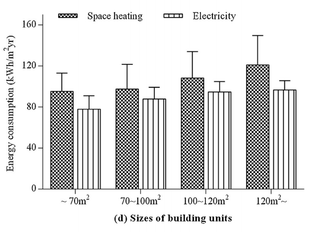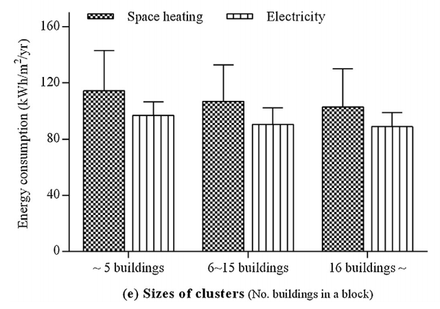 Secondly, old apartment buildings in large apartment clusters consumed less energy than those in small apartment clusters. The amount of energy reduced according to the sizes of clusters, a maximum 12 kWh/m2/year for space heating and 9 kWh/m2/year for electricity which were not as significant as the reductions for other features. Thirdly, the types of building layout showed increases with 5 kWh/m2/year in electricity from linear to grid.