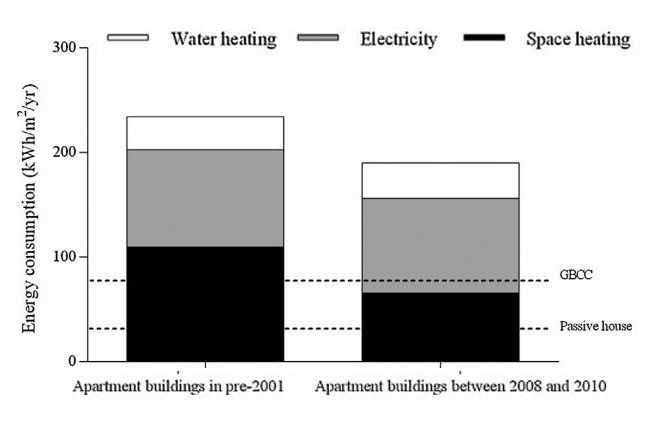 reduced to satisfy these energy rating systems. Despite excessive energy consumption, detailed consumption (separated by use) indicates different tendencies. Old apartment buildings consumed 109.6 kWh/m2/year for space heating whilst apartment buildings built between 2008 and 2010 only consumed 66.0 kWh/m2/year. On contrary, energy consumption of electricity and water heating did not have significant reductions in this period.