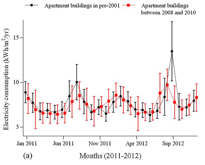 Energy consumption for electricity was not reduced in this period; 92.2 kWh/m2/year of electricity was continuously consumed by apartment buildings in both groups. This can be explained by the everyday use of domestic appliances such as refrigerators, televisions and computers. However, Fig. 4 demonstrates that the summer use of electricity for space cooling in the old apartment building was especially high in August. In each month, there was only 0.05 kWh/m2/year difference between apartment buildings in the both groups, except for August when the gap was enlarged to 1.5 kWh/m2/year in 2011 and 5.7 kWh/m2/year in 2012.
