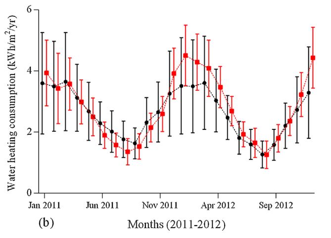 Figure 4 Monthly energy consumption between for (a) electricity and (b) water heating 2011 and 2012
