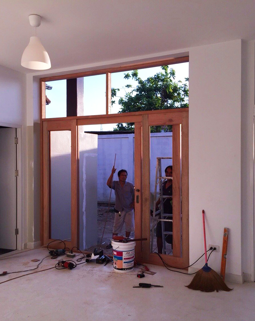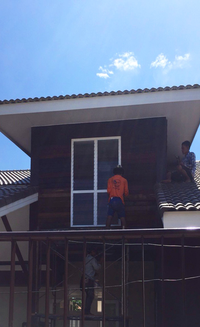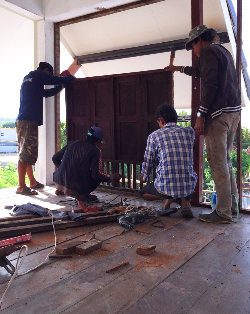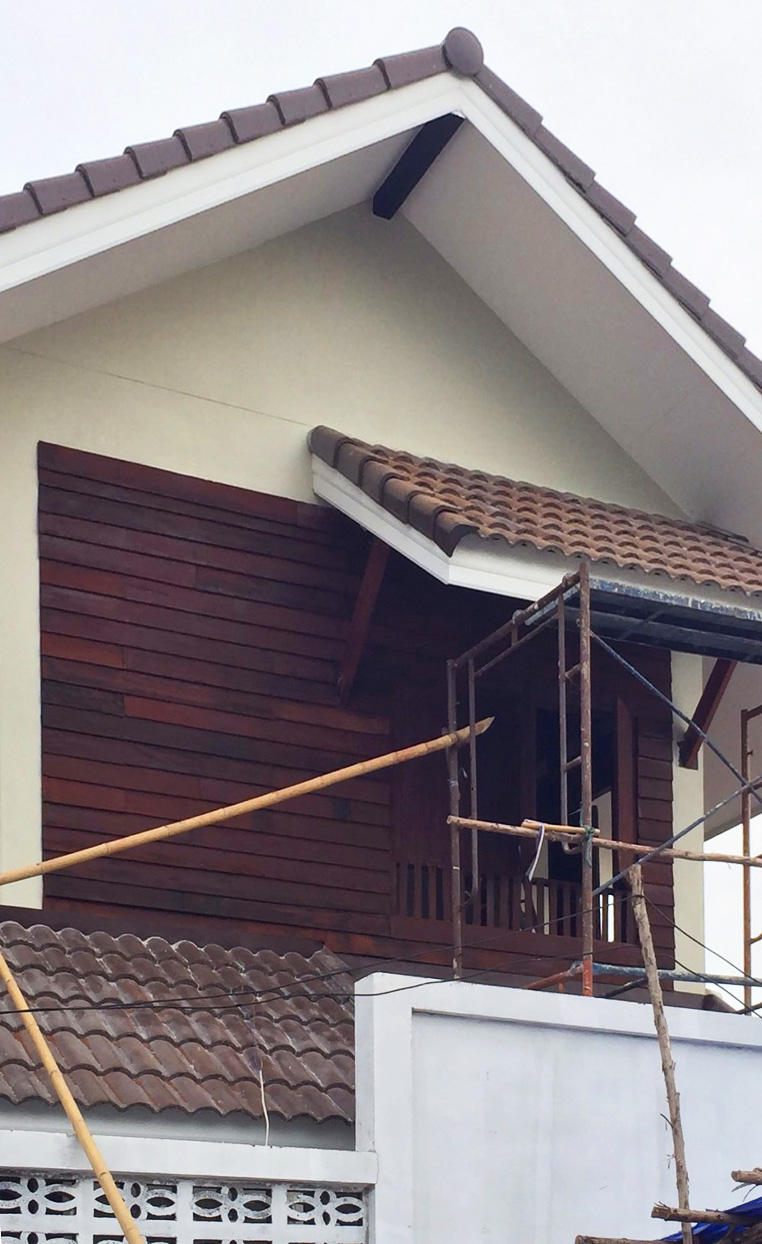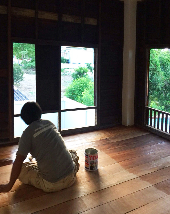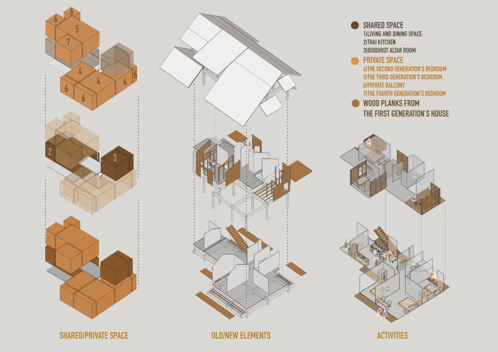 Main materials of the house are reinforced concrete structure and plastered brick walls. Balconies of shared spaces and bedrooms, and Buddhist altar rooms are paved by reclaimed wood planks from the house of the first generation. Walls, windows, and ventilation grills of the Buddhist altar room are also made from the reclaimed wood. The rest of the reclaimed wood is used to make walls for the future bedroom of the fourth generation. All these arrangements are done according to three reasons. First, the amount of reclaimed wood possible to be improved and used fits the areas mentioned. Second, the use of the reclaimed wood in these areas remind all members of the family their memory about the first generation. Third, the installations of wood components in these spaces could be done after all members of the family have moved in the new house and have already had both shared spaces and their private spaces to stay.