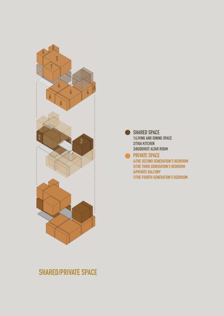 The new two-story house comprises shared spaces and private spaces. Its shared spaces bring all members of all four generations together and interact whenever each of them wants. Its private spaces are bedrooms and balconies. Each member of the family has his/her/their own private bedroom and balcony for private time. The ground floor locates shared spaces and private bedrooms of members of the second generation – the elderly. The upper floor locates the bedroom of the third generation and a Buddhist altar room. These arrangements are designed to ensure interactions among family members while maintaining their freedom to live their private lives. They also serve practical purposes such as minimizing the need for elderly members to climb up stairs, and belief in auspiciousness that putting the altar on the high point of the house.