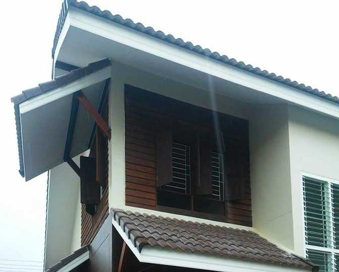 The house has a rectangular plan. It is located in a square plot of land. The front of the house faces south, and the back faces north. Two bedrooms and private balconies are placed in front opening toward a small front garden. Another bedroom faces a larger garden at the back. Shared spaces are opened toward both sides. This arrangement allows the prevailing wind from the south past through the shared spaces where all members of the family tend to use in most of day time. It also allows the wind to flow diagonally through all three bedrooms and their balconies, ensuring comfort whenever the occupiers of the room want private time. A Thai kitchen is located in a semi-outdoor space at the west side, receiving afternoon sun that ensures hygiene while blocking it to penetrate the shared space. It also easily ventilates out strong smell and smoke from Thai cooking. On the upper floor, the bedroom of the member of the third generation and his wife has a large balcony and a separate access adjacent to it from the back garden. It is also adjacent to a bedroom for the forth generation in the future (now she sleeps with her parents and enjoys a slider at their balcony). The other side of the upper floor, the northeast corner, locates a buddhist altar room where members of the family could go to worship and do meditation in a seclusive and comfort atmosphere. All rooms on both floors are shaded by long eaves, a feature used in the house of the first generation and Rayong’s old wooden shophouses that well-responds to tropical climate.
