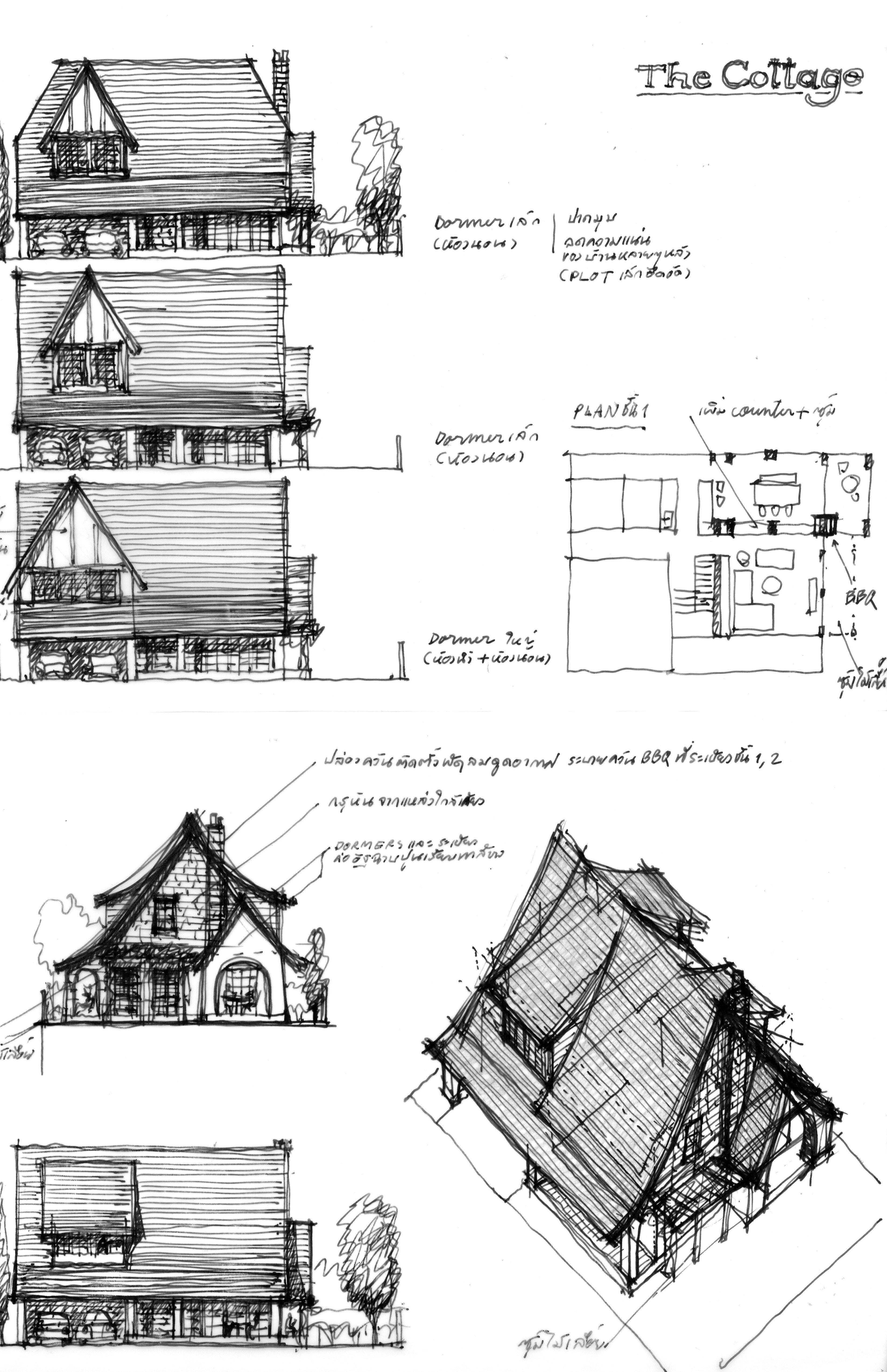 Even though we respected the opinion of fellow architects who may be willing to responded to whatever clients demanded, we also concerned about impacts of whatever architects did that might cost society and environment. However, we were open minded enough to listen to and try to understand what people outside our profession wanted, no matter they were developers or their new rich customers. We also believe that no architectural style or principle fit all projects. That was why we agreed to work with our client on the Emerald Creek project to design an “English Cottage” style vacation house in Muak Lek.