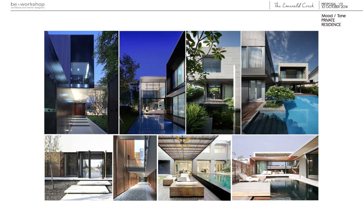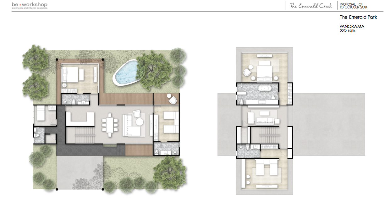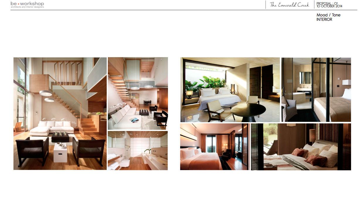 This project started in 2017, when a client commissioned us to design a vacation housing in Muak Lek, a beautiful countryside in a valley 160 kilometre from Bangkok. We initially conceptualised the project as a complex of modernist villas with open plans, large openings, cosy indoor space, and airy semi-outdoor space that would allow the residents to enjoy nice atmosphere and scenery, while providing them comfort shelters from tropical climate. During preliminary design, we proposed lay outs and plans, as well as images of “moods and tones” as follows: