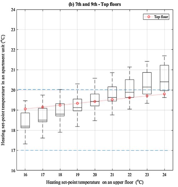 The units from the ground to 6th and 8th floors show the possible range of heating set-point temperatures on an upper floor between 18.5 and 22.5 ◦C in accordance with heating set-point temperature on an upper floor (Fig. 5(a)). The possible range among the 7th and 9th to top floors is between 17 and 21.5 ◦C (Fig. 5(b)). This result shows that the temperature range between 17 and 20 ◦C, which is defined as the 90% probability of heating set-point temperatures with the whole building approach, would underestimate heating energy use in apartment units on the lower floors (the ground- 6th and 8th floors), whereas it could be relatively accurate for the upper floors (the 7th and 9th – top floors).