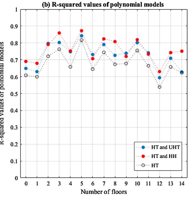 This is also proved by R-squared values of polynomial models, as indicated in Fig. 3(b). These two conditions are integrated into the polynomial regression models to be used for further predictions: heating controls in each apartment unit (blue dotted lines in Fig. 3(b)) and heating set-point temperatures between floors (red dotted lines in Fig. 3(b)). Compared to the polynomial models with one variable, heating set-point temperatures (white dotted lines in Fig. 3(b)), polynomial models with two variables have higher R-squared values. Adding one more independent variable either heating hours or set-point temperatures on an upper floor raises R-squared values. However, the different is not significant enough to disregard the impact of the set-point temperatures between floors.