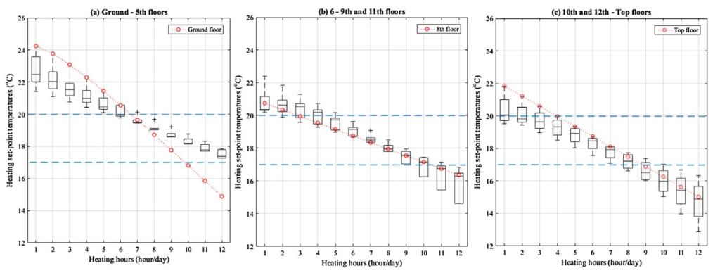 With the set of the model for heating set-point temperature between floors, the lower floors from the ground to the eighth floors, except for the 7th floor, require higher heating set-point temperatures, above 20 ◦C although the heating set-point temperatures on the higher floors from the seventh to the top floor, except for the 8th floor, are the probable range.