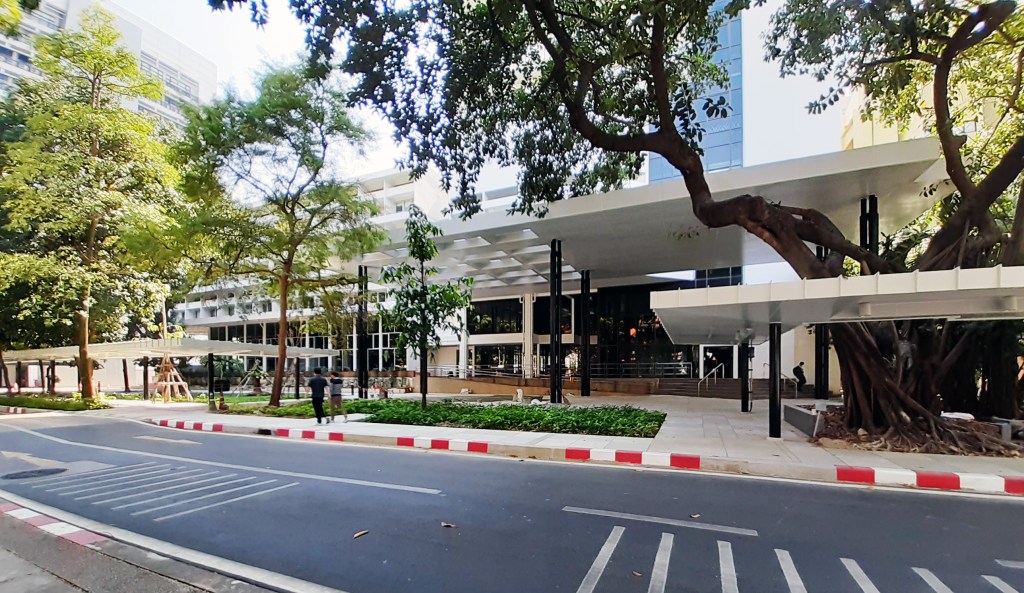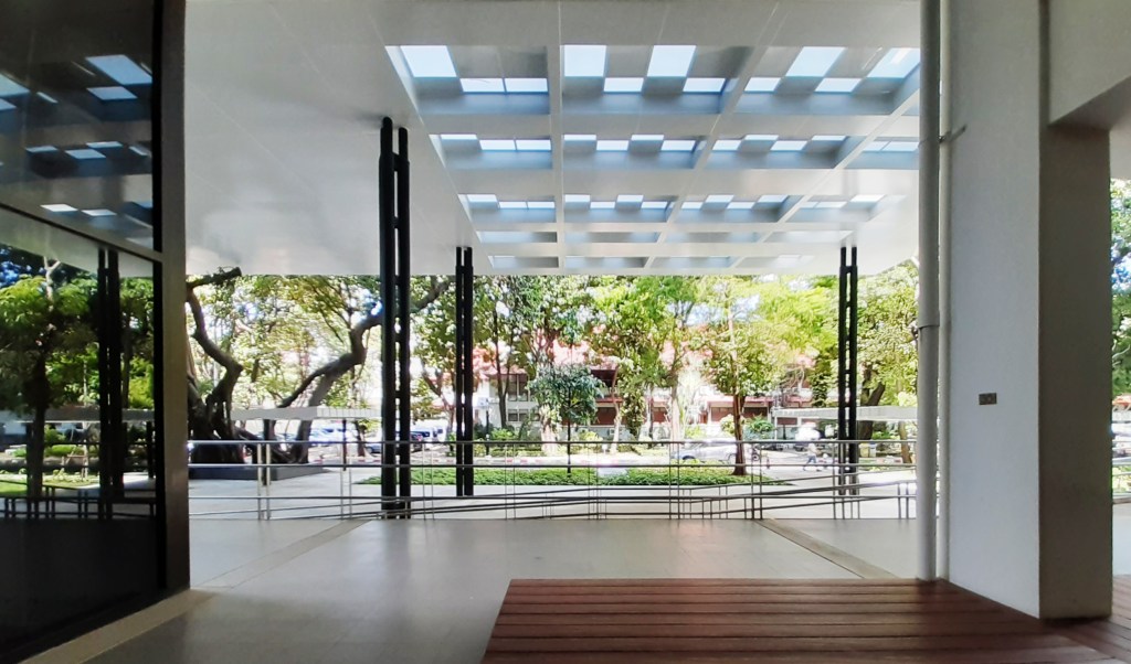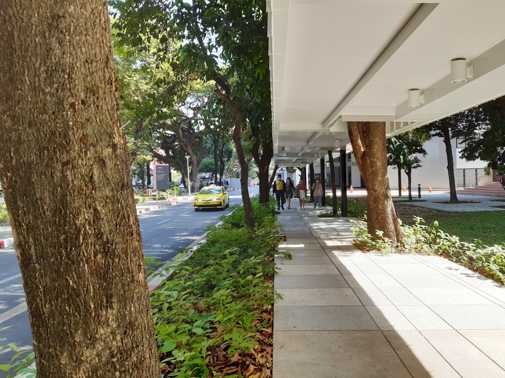 The design includes the replacement of car parking spaces with universally accessible landscapes and hardscapes for pedestrians and students’ activities. Some of the hardscapes are covered with a series of white roofs on black columns, designed to visually be perceived as “floating white planes, integrating with a predominantly white modernist facades of existing buildings and blending with existing large trees.
