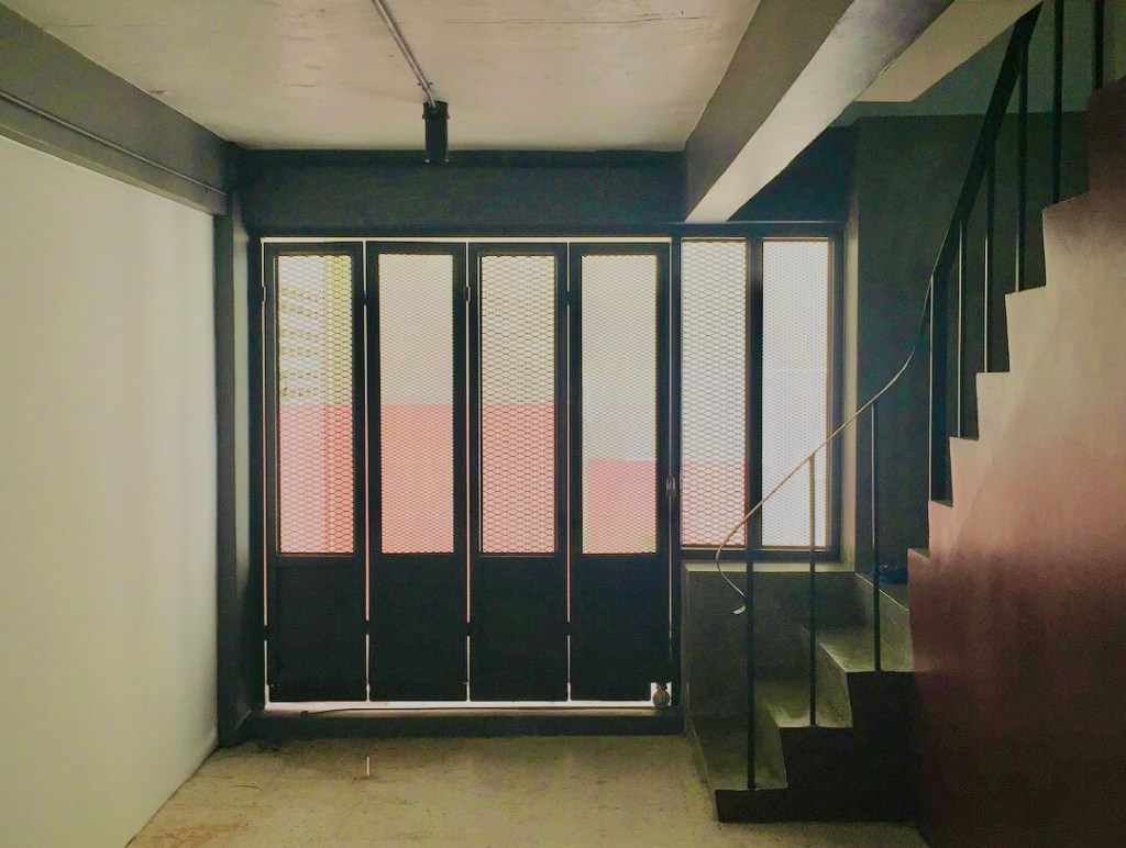 Comparing the staircases and backyards of Prototype 1 and Prototype 2, both prototypesā backyard, previously covered by an illegally addition of a roof structure, have been opened up to bring natural light in and to let wind flow through the ground floor space to other floors. Pink ceramic tiles from the 1980s-kitchen are kept on the wall of the Prototype 1ās backyard (left).